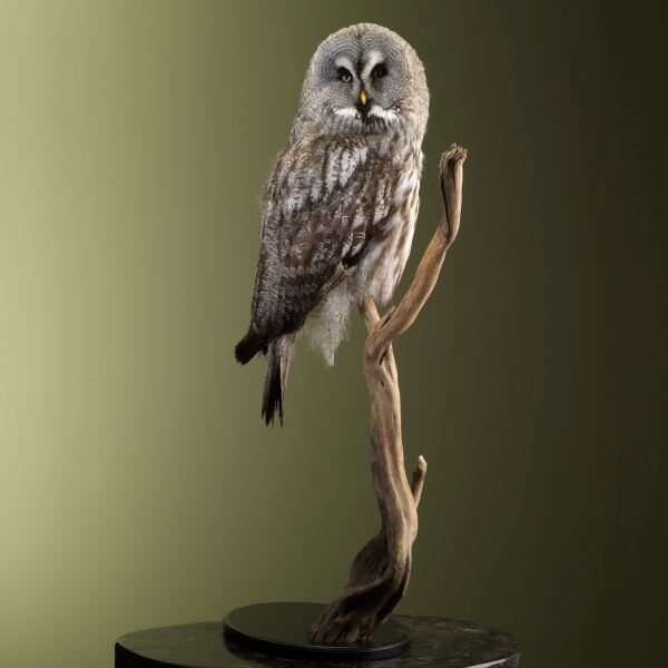 De opgezette Laplanduil (Strix nebulosa) is een indrukwekkend voorbeeld van taxidermie, die de schoonheid en het majestueuze karakter van deze vogel in al zijn glorie weergeeft. De Laplanduil, ook wel bekend als de Grote Grijze Uil, komt voor in de koude, boreale bossen van Noord-Amerika en Eurazië. Deze uil is beroemd om zijn imposante verschijning en scherpe jachtvaardigheden.